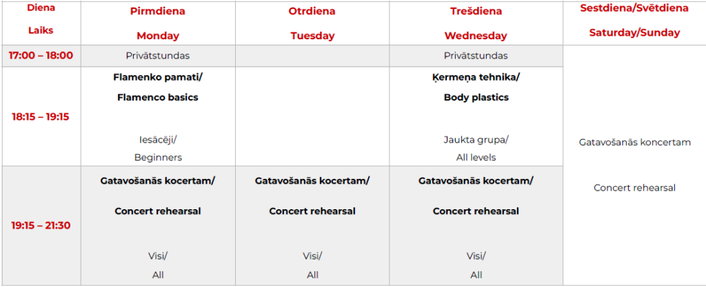 Dejas horeogrāfija tiek piemērota katrai grupai atkarībā no līmeņa. Mēs mācāmies Mirabras, Canasteras, Farruca, Alegrijas, Solea ar lakatu un citas skaitas flamenko dejas.